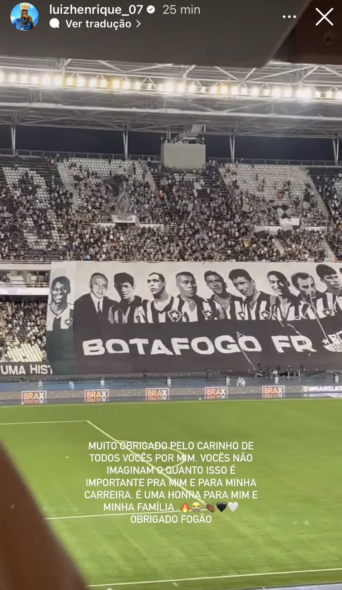 “Muito obrigado pelo carinho de todos vocês por mim. Vocês não imaginam o quanto isso é importante para mim e para a minha carreira. É uma honra para mim e minha família. 🔥😭👏🏾🖤🤍”, escreveu Luiz Henrique, no Instagram, após a vitória do Fogão sobre o Juventude, pelo Brasileirão, neste sábado (5/4).