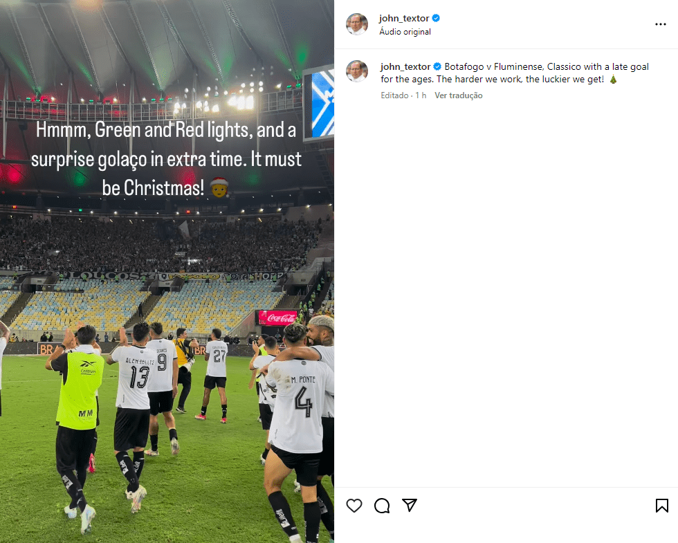 “Hmmm, luzes verdes e vermelhas e um golaço surpresa nos acréscimos. Deve ser Natal!“, escreveu John Textor no Instagram, brincando com as cores do adversário.