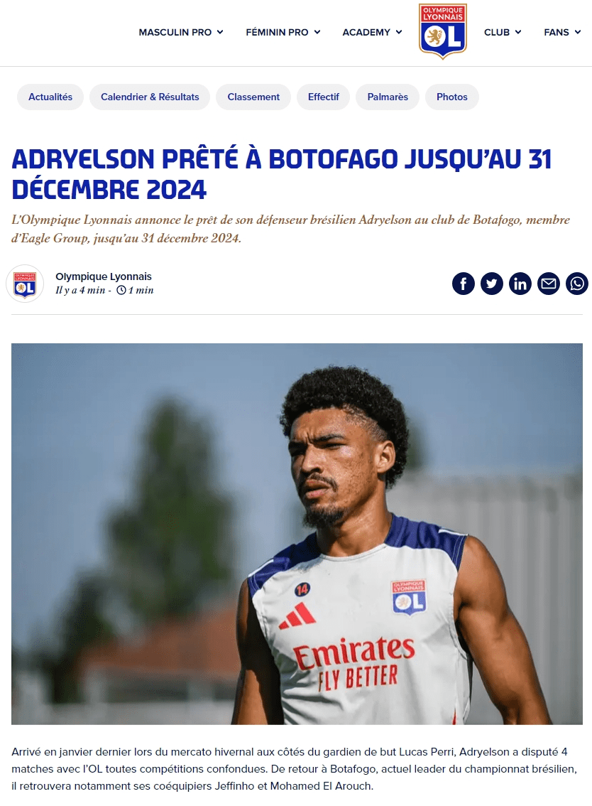 O Olympique Lyonnais anuncia o empréstimo do zagueiro brasileiro Adryelson ao Botafogo, membro do Eagle Group, até 31 de dezembro de 2024.