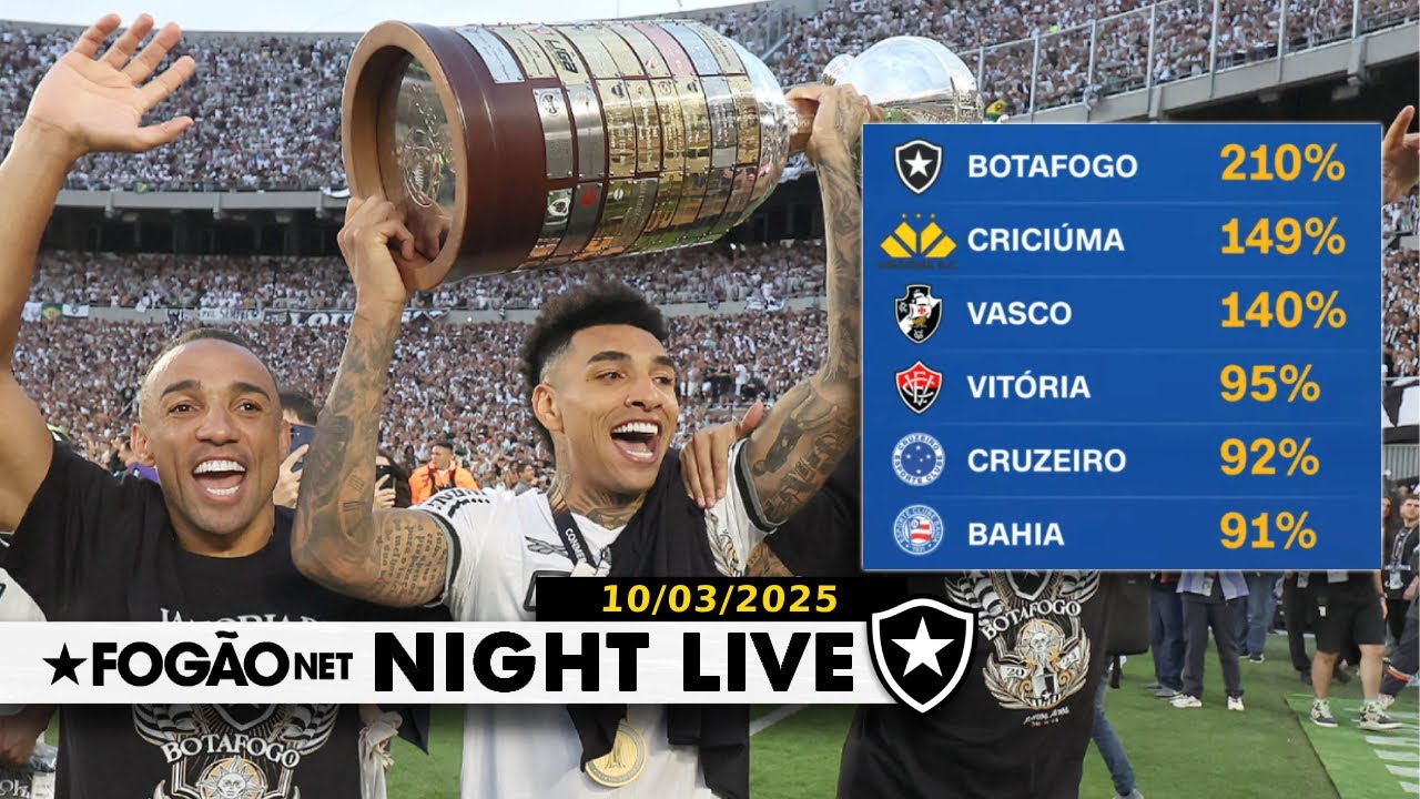 O FogãoNET entra no ar na noite desta segunda-feira (10/3) para repercutir o estudo da “SportsValue” que mostrou que o Botafogo foi o clube que mais se valorizou no futebol brasileiro em 2024. Especialista vê potencial no Glorioso virar top 5 do Brasil.