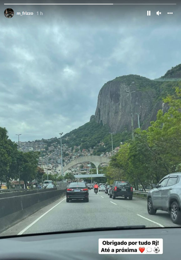 “Obrigado por tudo, RJ! Até a próxima”, postou Frizzo enquanto trafegava na Autoestrada Lagoa-Barra, próximo à Rocinha, na Zona Sul da cidade.