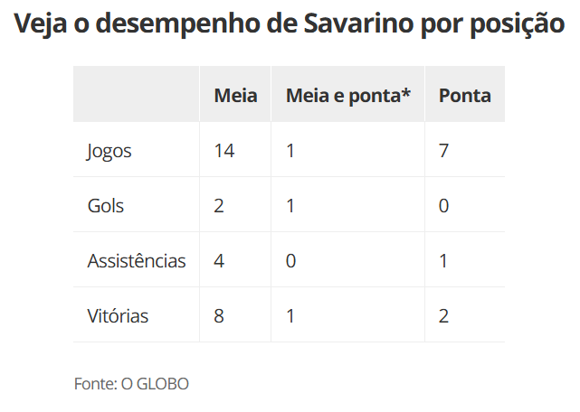 “O Globo” lembra ainda que Savarino teve um jogo em que desempenhou as funções de meio-campo e ponta: foi na vitória sobre o Fluminense por 2 a 1 pelo Carioca, ainda sob o comando de Carlos Leiria, quando ele marcou um gol de pênalti.