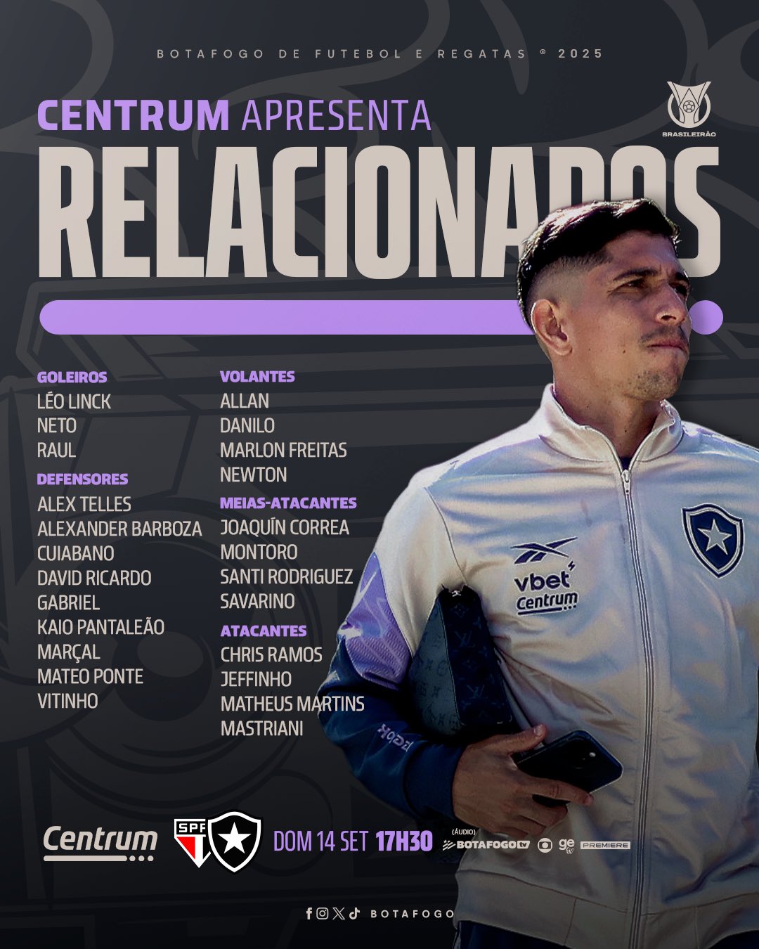 O Botafogo divulgou neste sábado a lista de relacionados para o jogo contra o São Paulo, que será realizado neste domingo (14/9), no Morumbis, pela 23ª rodada do Campeonato Brasileiro. Os atacantes Arthur Cabral e Artur são as principais ausências.