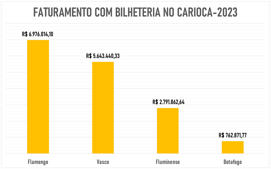 A arrecadação do Botafogo foi bem inferior à dos rivais. O Flamengo, vice-campeão, teve lucro de bilheteria de quase R$ 7 milhões, seguido pelo semifinalista Vasco (R$ 5,6 milhões) e pelo campeão Fluminense, que embolsou no total quase R$ 2,8 milhões.