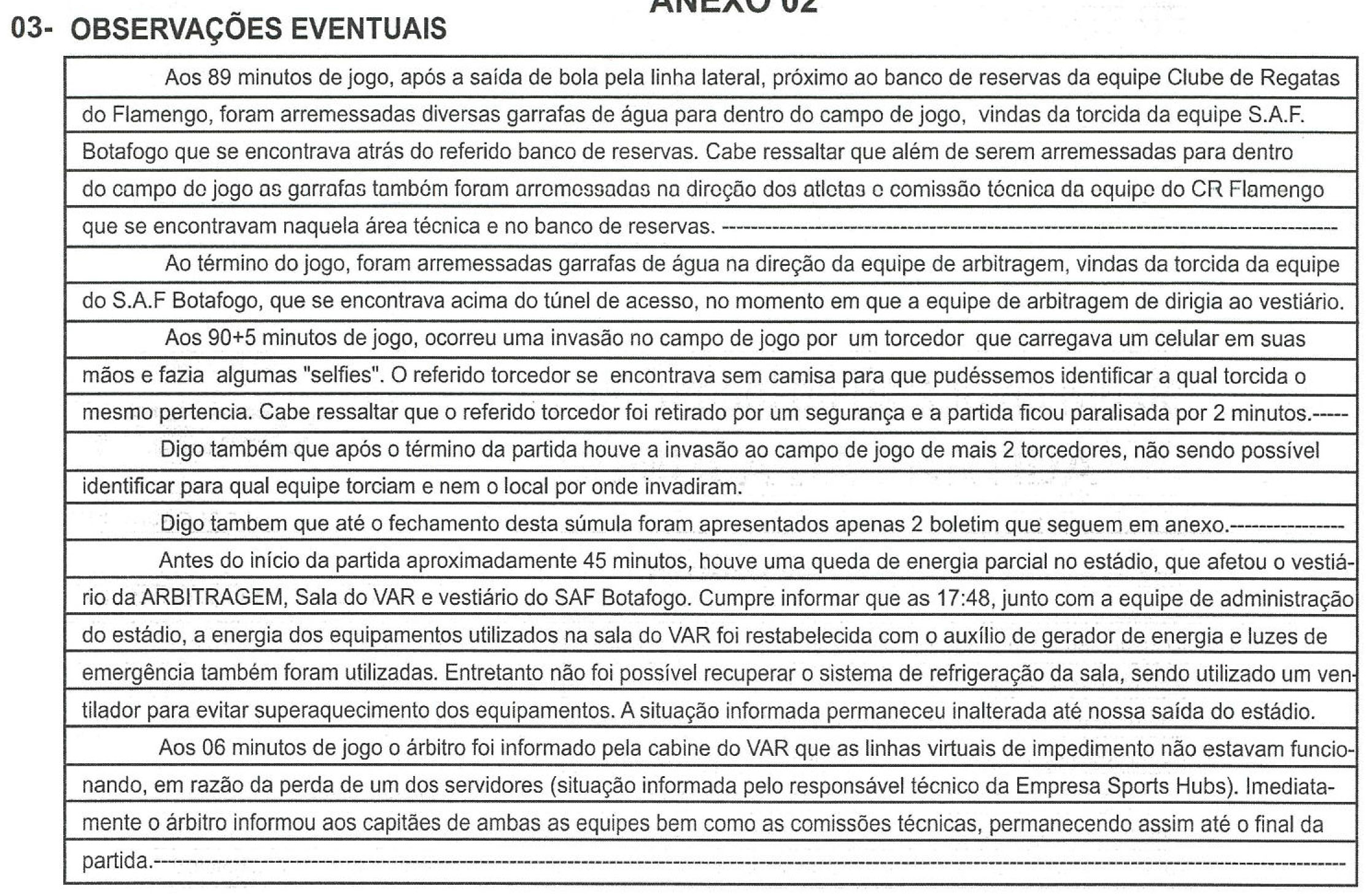 Por outro lado, o árbitro Tarcizo Pinheiro Caetano relatou na súmula que garrafas de água foram arremessadas por torcedores do Botafogo em direção aos jogadores e comissão técnica do Flamengo já perto dos acréscimos do segundo tempo.