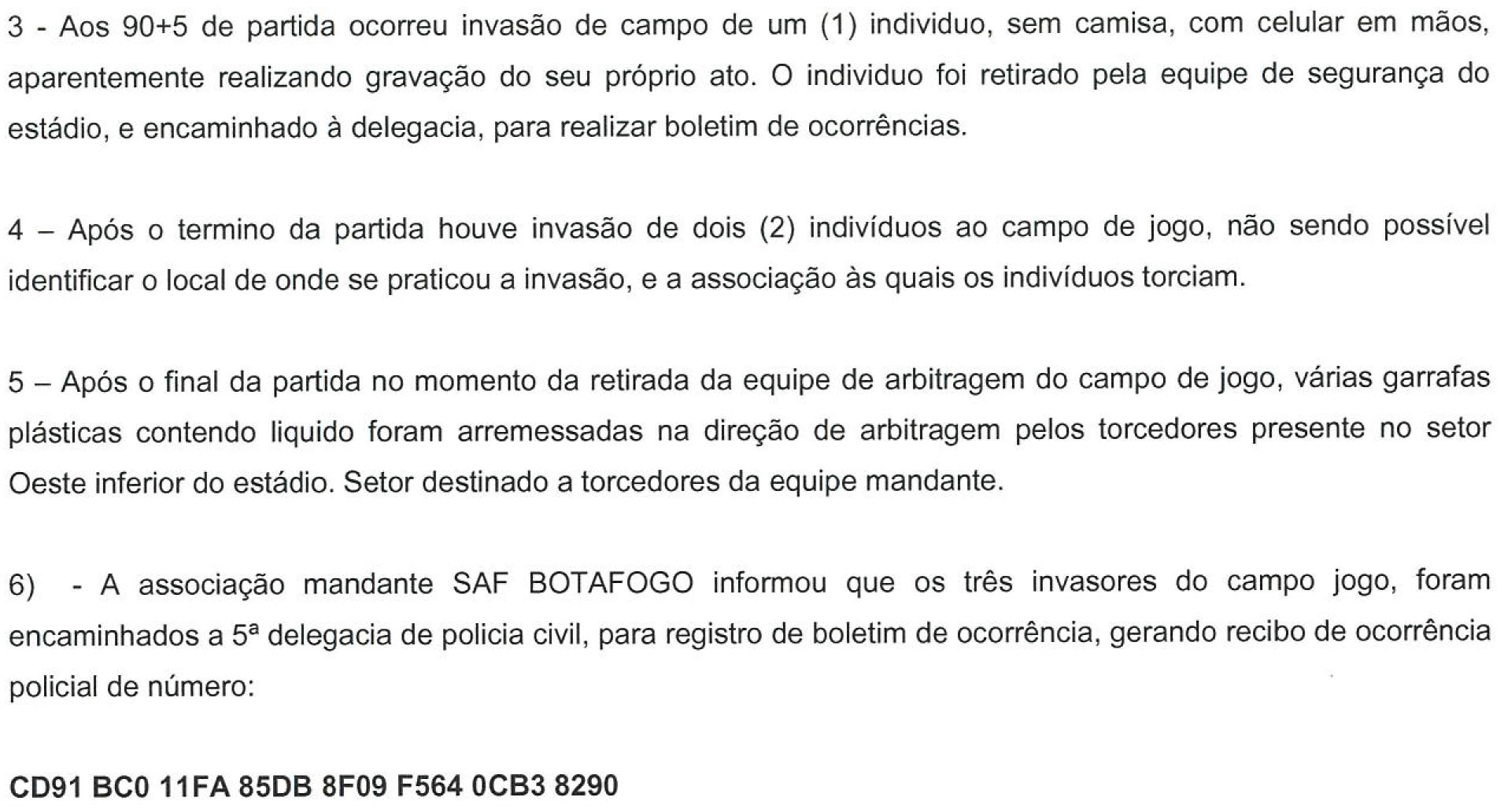 De acordo com o relato, o Botafogo informou que os três invasores foram encaminhados à 5ª Delegacia de Polícia Civil e um registro de ocorrência foi registrado, o que pode atenuar eventuais punições ao clube na Justiça Desportiva.