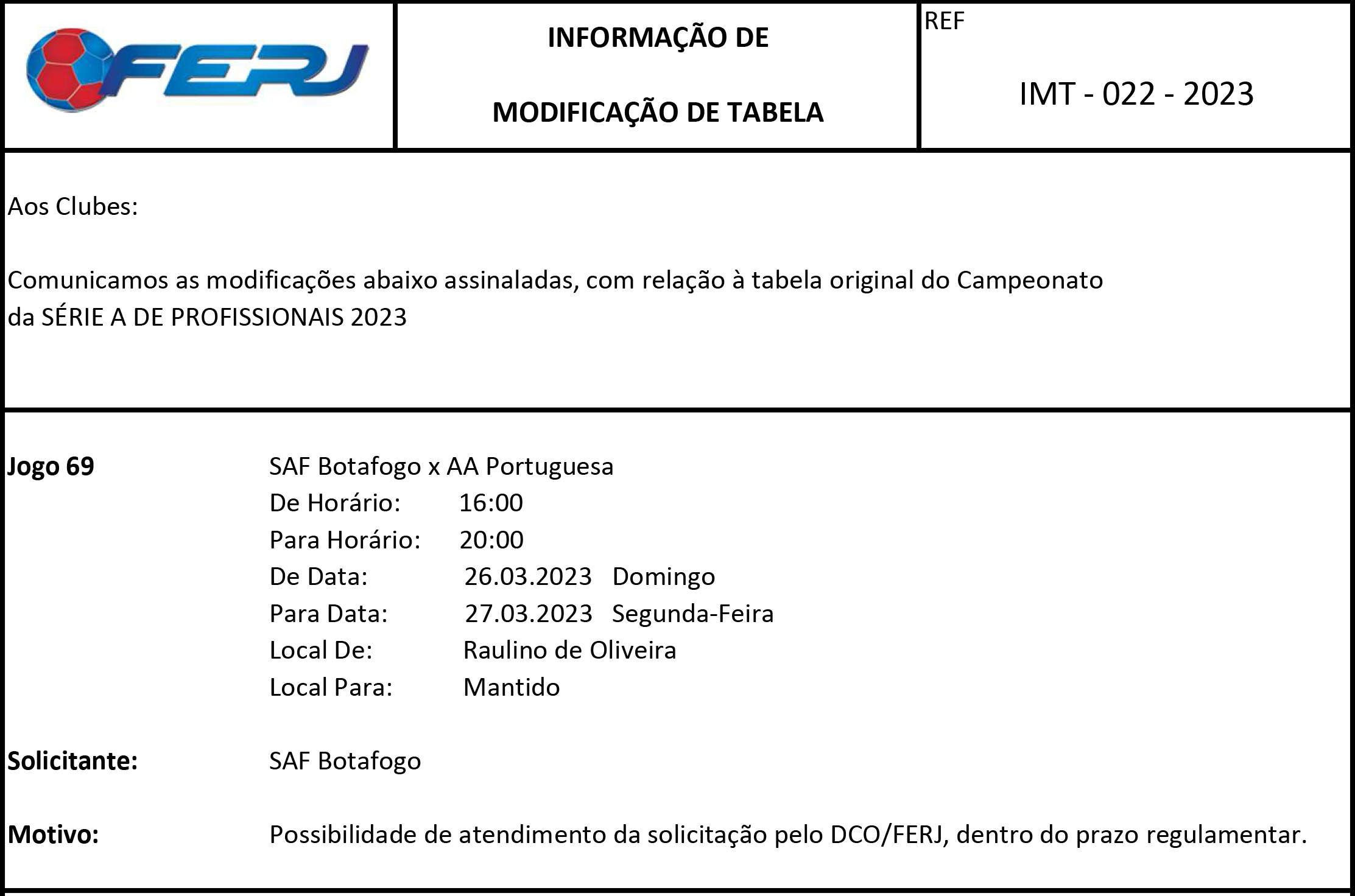 O jogo de volta pelas semifinais da Taça Rio-2023 entre Botafogo e Portuguesa mudou. A pedido do Glorioso, a partida acontecerá agora no dia 27 de março, uma segunda-feira, às 20h. O local foi mantido, por conta das punições do TJD-RJ: Estádio Raulino de Oliveira.