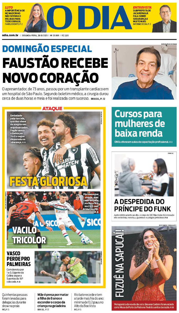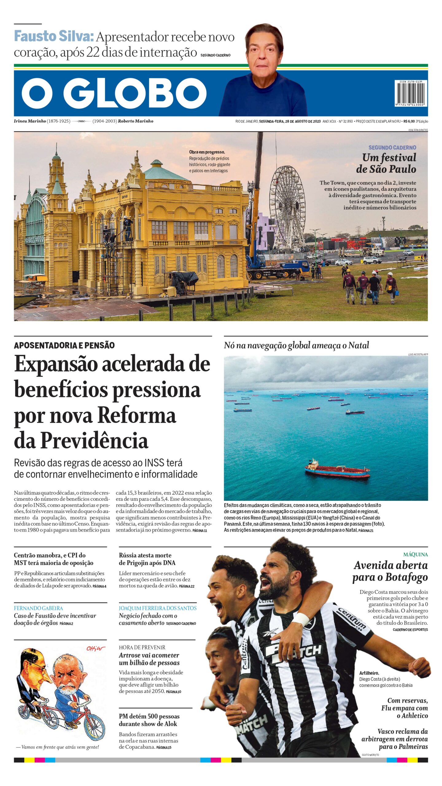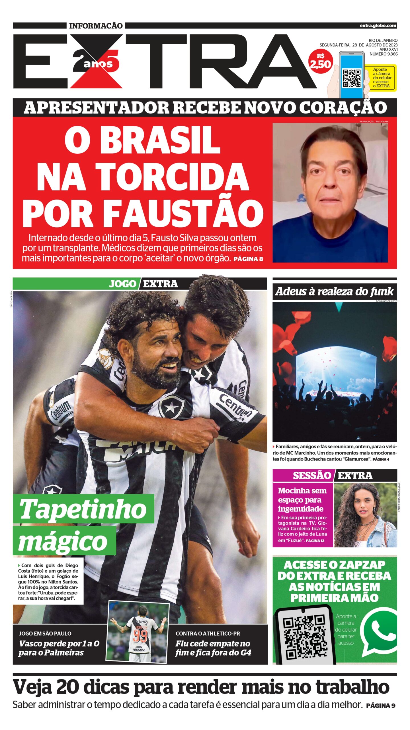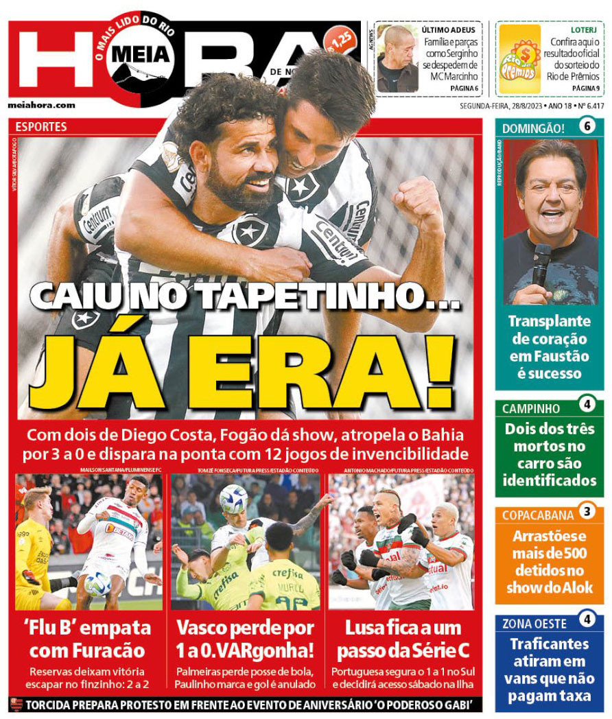 Líder isolado do Campeonato Brasileiro-2023, o Botafogo dominou as capas dos jornais do Rio de Janeiro nesta segunda-feira (28/8). Todos eles deram destaque à vitória sobre o Bahia, no Estádio Nilton Santos, e Diego Costa esteve onipresente nas manchetes.