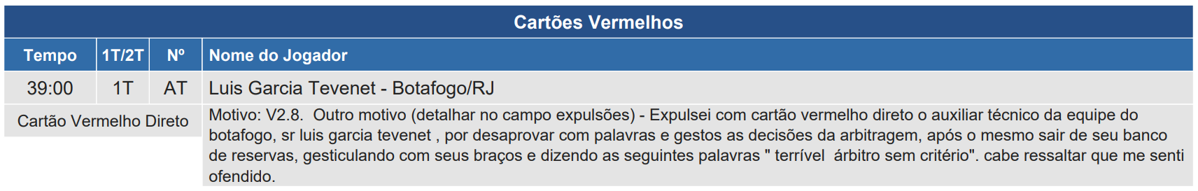 “Expulsei com cartão vermelho direto o auxiliar técnico da equipe do Botafogo, Sr. Luis Garcia Tevenet, por desaprovar com palavras e gestos as decisões da arbitragem, após o mesmo sair de seu banco de reservas, gesticulando com seus braços e dizendo as seguintes palavras ‘terrível árbitro sem critério’. Cabe ressaltar que me senti ofendido“, escreveu Arleu.
