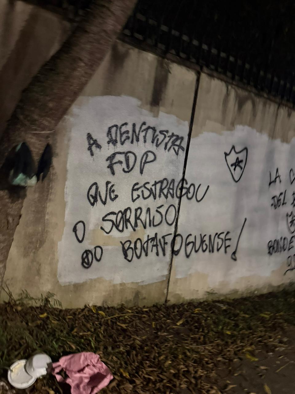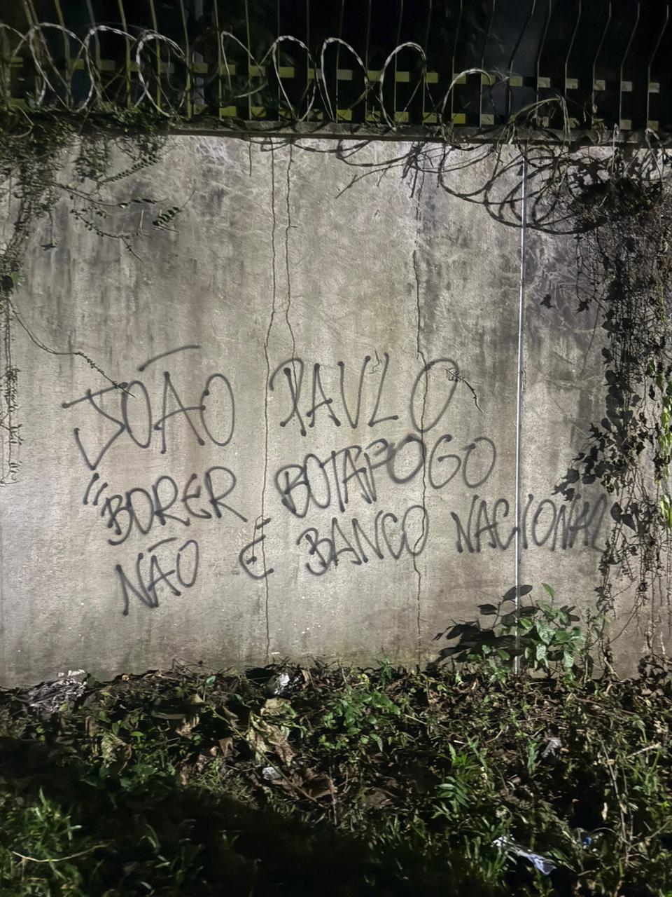 Entre os dizeres, estão “Fora, social”, “Textor is bigger than Montenegro” (John Textor é maior que Carlos Augusto Montenegro“), “JP Borer não” (comparando o presidente João Paulo Magalhães Lins ao ex-presidente Charles Borer, que “perdeu” a sede de General Severiano na década de 70), “dentista fdp que estragou o sorriso do botafoguense” (uma possível alusão ao atual vice-presidente André Silva ter sido vice de futebol de Mauricio Assumpção) e “vai ter golpe”.