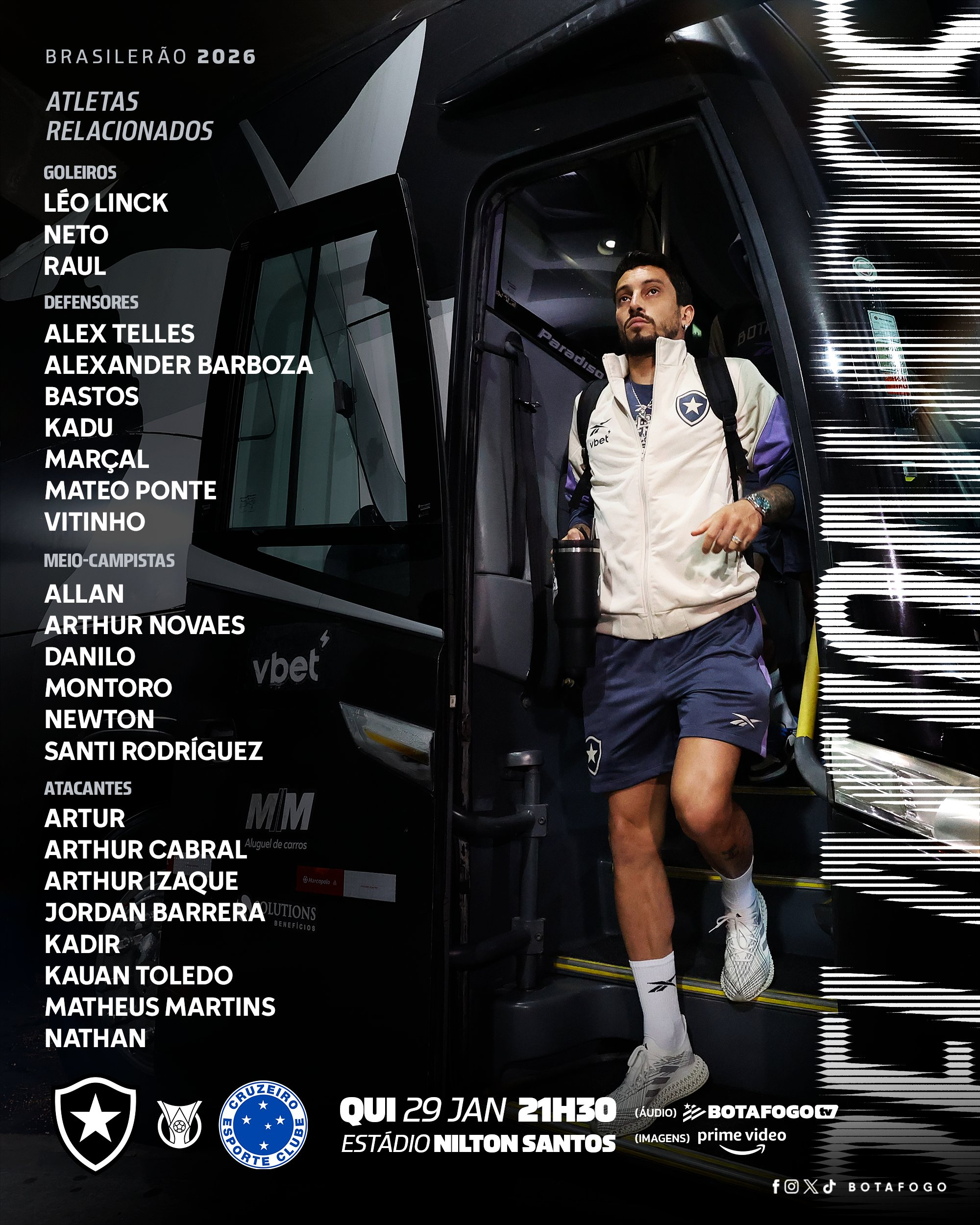 Com o retorno so zagueiro Bastos, o Botafogo divulgou a lista de relacionados para enfrentar o Cruzeiro nesta quinta-feira, às 21h30, no Nilton Santos, pela primeira rodada do Campeonato Brasileiro.