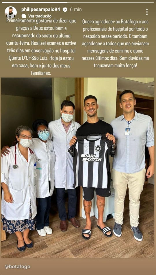 “Primeiramente gostaria de dizer que graças a Deus estou bem e recuperado do susto da última quinta-feira. Realizei exames e estive três dias em observação no hospital Quinta D’Or São Luiz. Hoje já estou em casa, bem e junto dos meus familiares. Quero agradecer ao Botafogo e aos profissionais do hospital por todo o respaldo nesse período. E também agradecer a todos que me enviaram mensagens de carinho e apoio nesses últimos dias. Sem dúvidas me trouxeram muita força“, escreveu Sampaio.